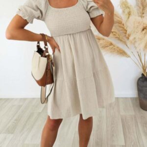 Cudowna sukienka mini muślinowa to idealna propozycja na letnie dni. W kolorze beżowym zachwyca subtelnym urokiem, natomiast krótki rękaw dodaje jej lekkości i świeżości. Doskonała na wieczorne spotkania oraz codzienne wyjścia. Zdecydowanie must-have w kolekcji każdej modowej entuzjastki. Rozmiar uniwersalny. Rozmiar: UniwersalnyKolor: BeżowyMateriał: 100% bawełnaDługość: MiniFason: Prosty z krótkim rękawem