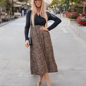 Sukienka midi w modny panterkowy wzór to doskonały wybór dla kobiet, które pragną poczuć się stylowo i pewnie. Wykonana z wysokiej jakości materiałów, jej skład to 47% wiskozy, 27% poliestru, 20% nylonu oraz 6% elastanu, co zapewnia nie tylko komfort noszenia, ale także odpowiednią elastyczność. Idealna na różne okazje – zarówno na co dzień, jak…