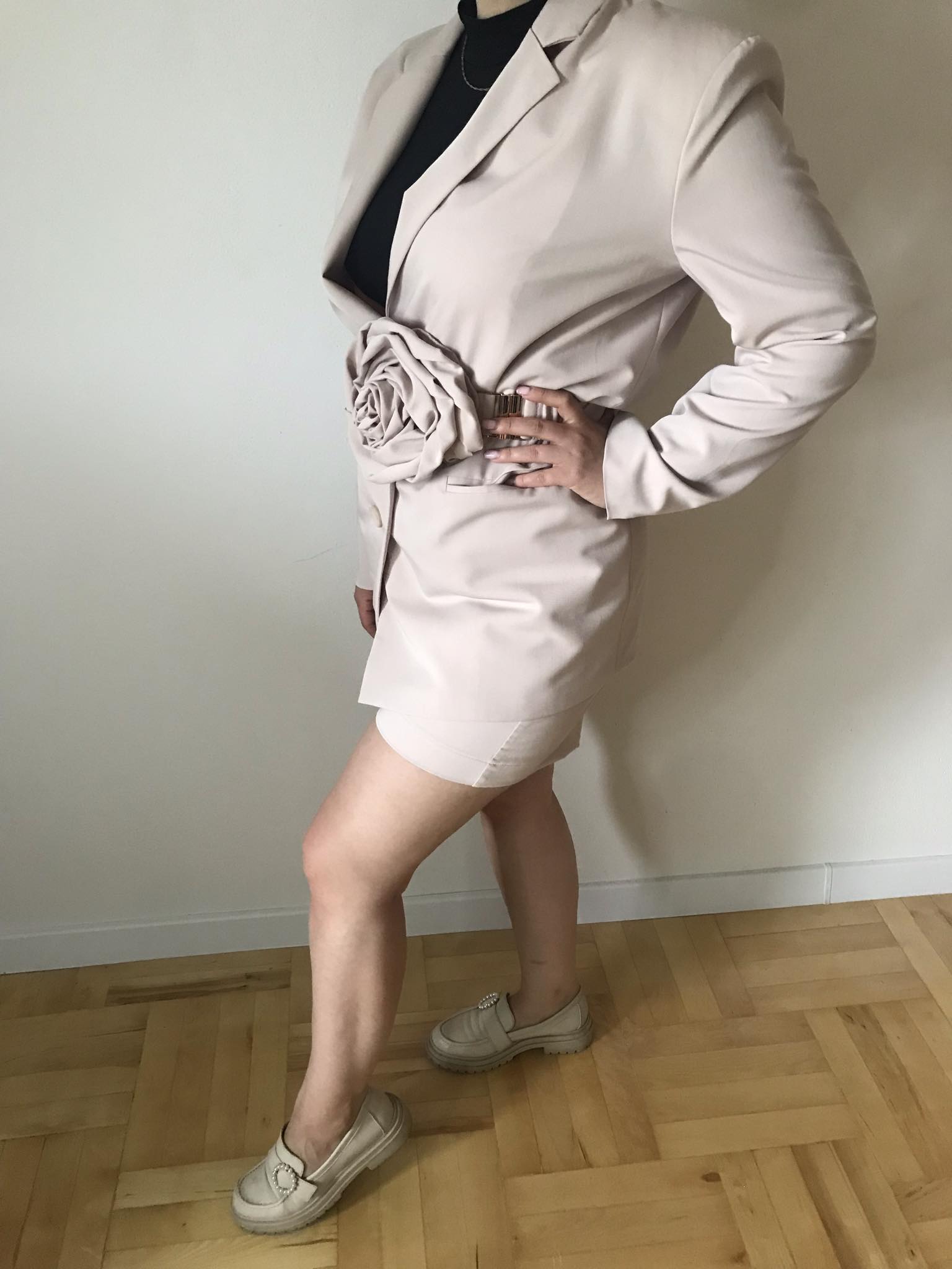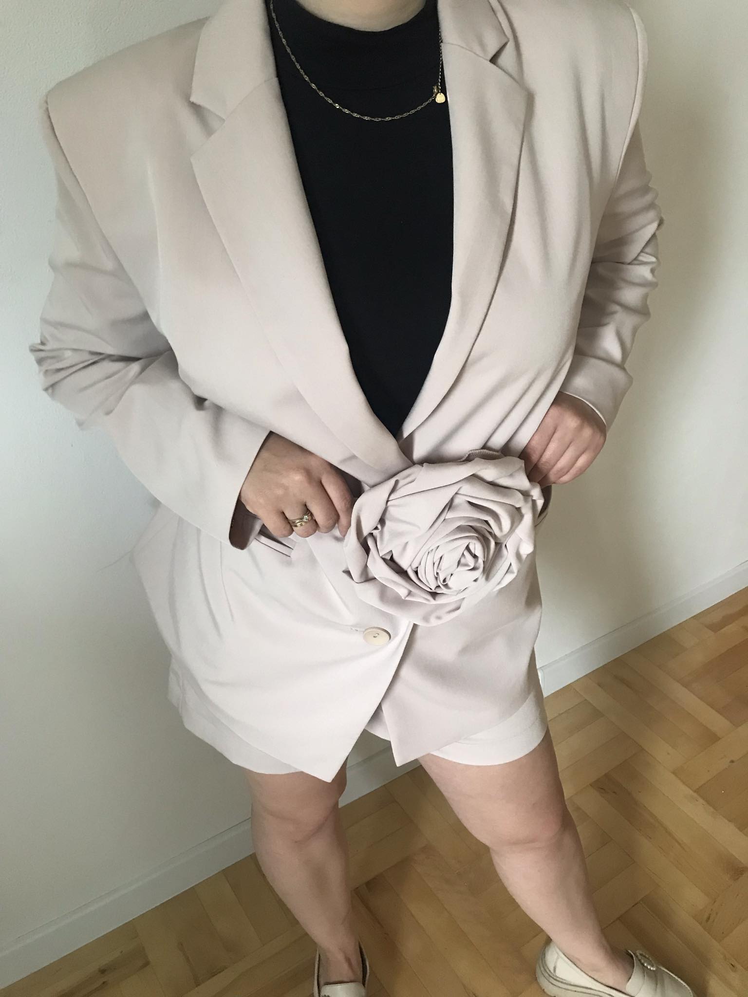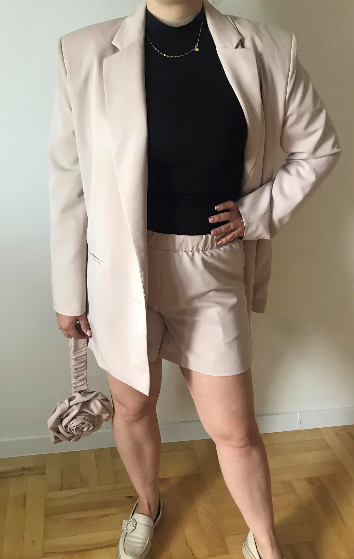 Szukasz oryginalnej stylizacji? Postaw na bawełniany zestaw z ozdobnym kwiatem. W skład kompletu wchodzi prosta marynarka oraz krótkie spodenki. Klasyczna w kroju marynarka posiada poduszki na ramionach i jest zapinana na dwa guziki. Dopasowane spodenki posiadają elastyczną gumkę z tyłu, dzięki czemu bardzo ładnie dopasowują się do sylwetki.