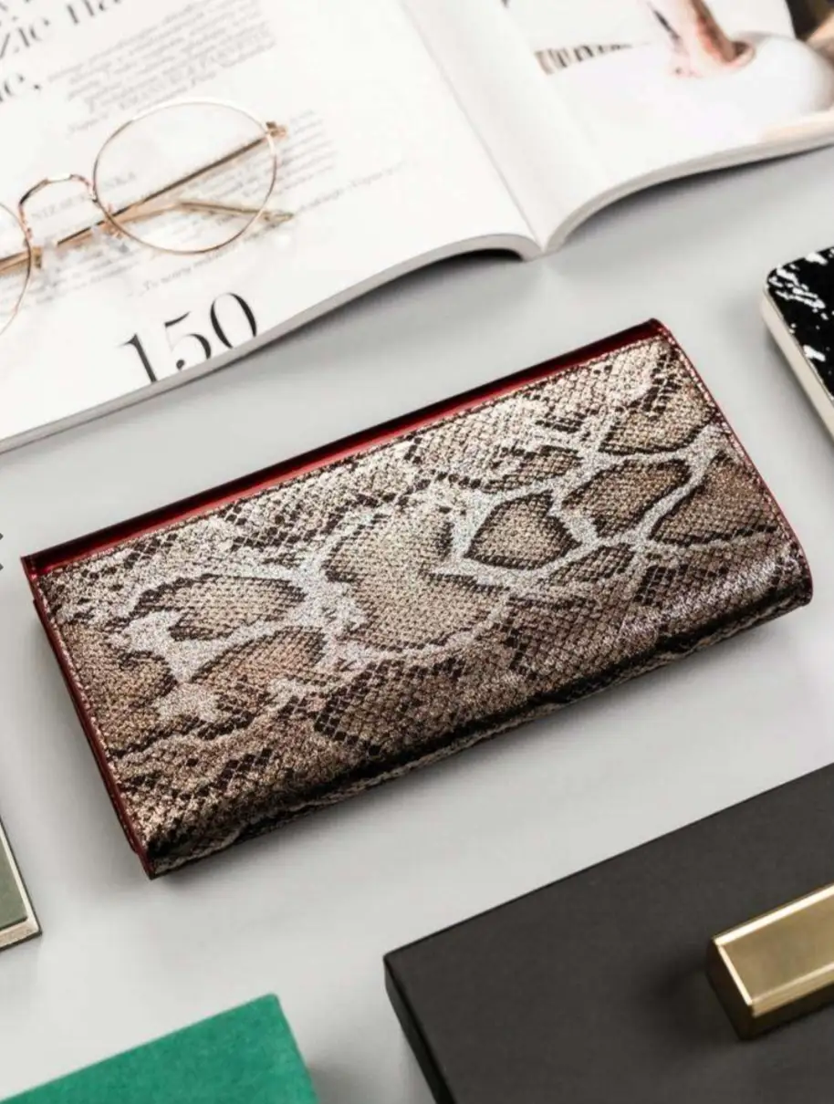 - Wzór z charakterem | Portfel o klasycznej stylistyce imitujący skórę węża. Model w orientacji poziomej zapinany na zatrzask;