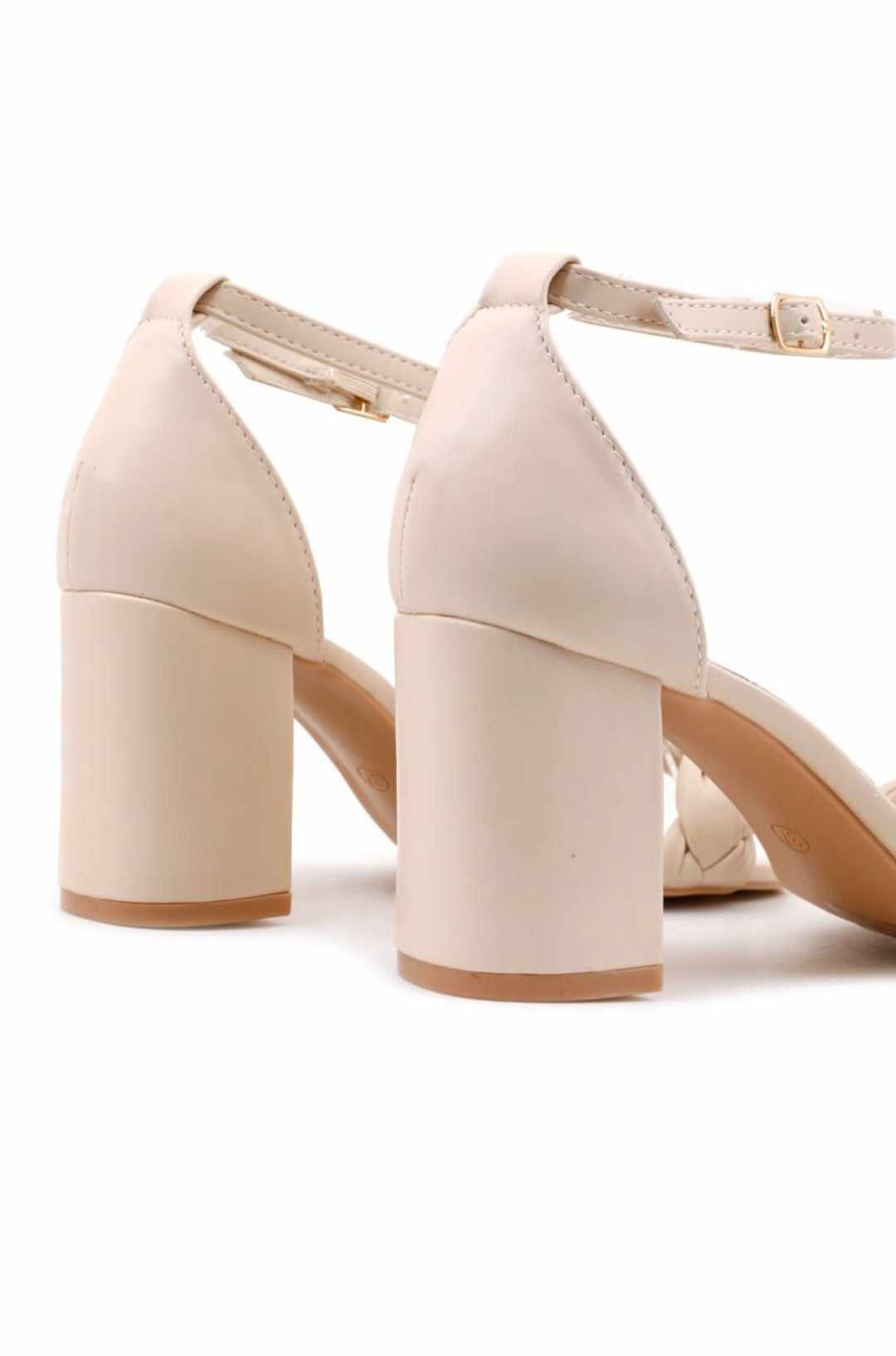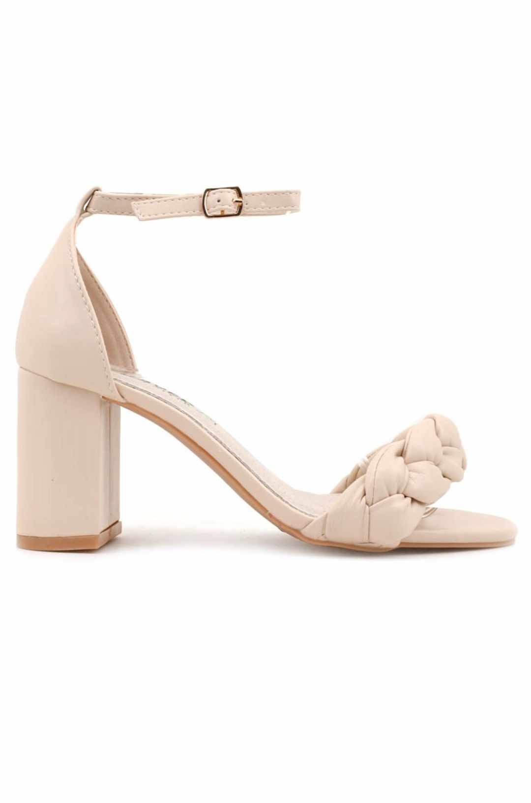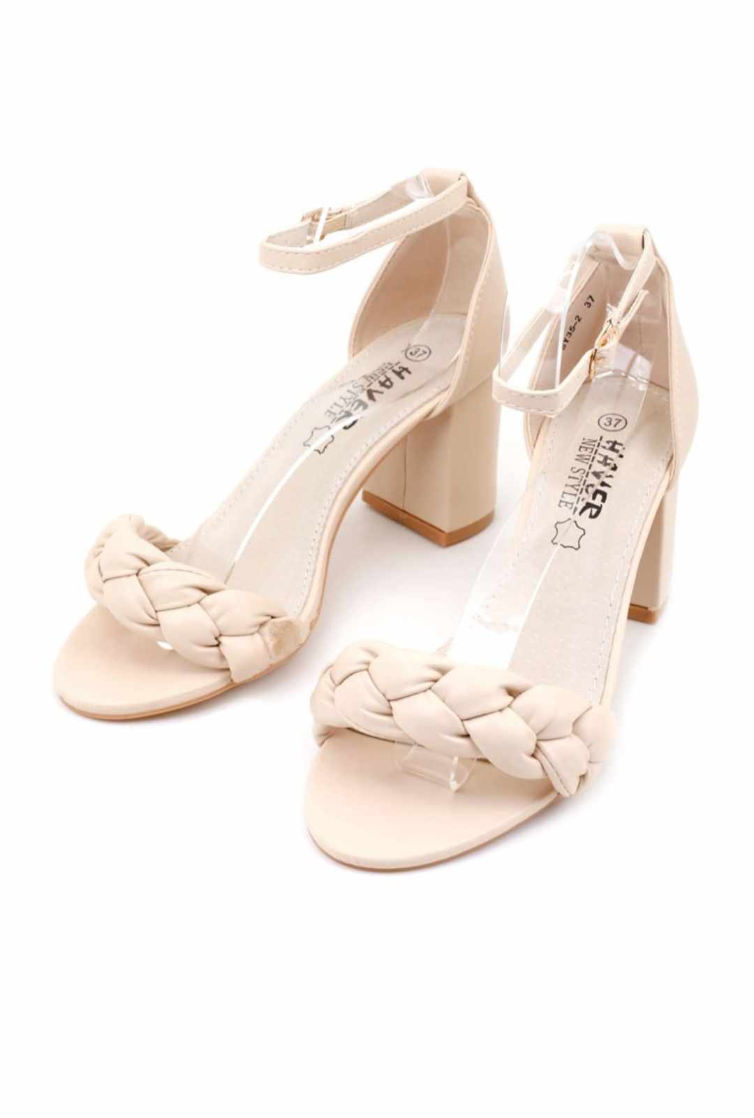 Sandały damskie na obcasie typu słupek. Z paskiem plecionym w warkocz wokół palców. Pięta zakryta. Kostkę oplata cienki pasek zapinany na sprzączkę. Wykonane z pięknej ekoskóry. Sandały fenomenalnie prezentują się na wesela albo imprezę.