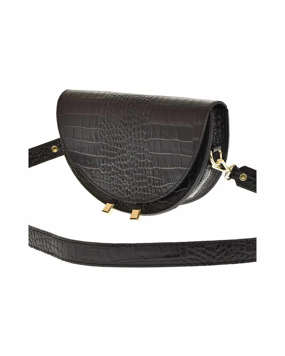 Wykonana w całości w krokodylej eko skóry, jest nieco mniejsza od klasycznych, tradycyjnie spotykanych półksiężycowych listonoszek.