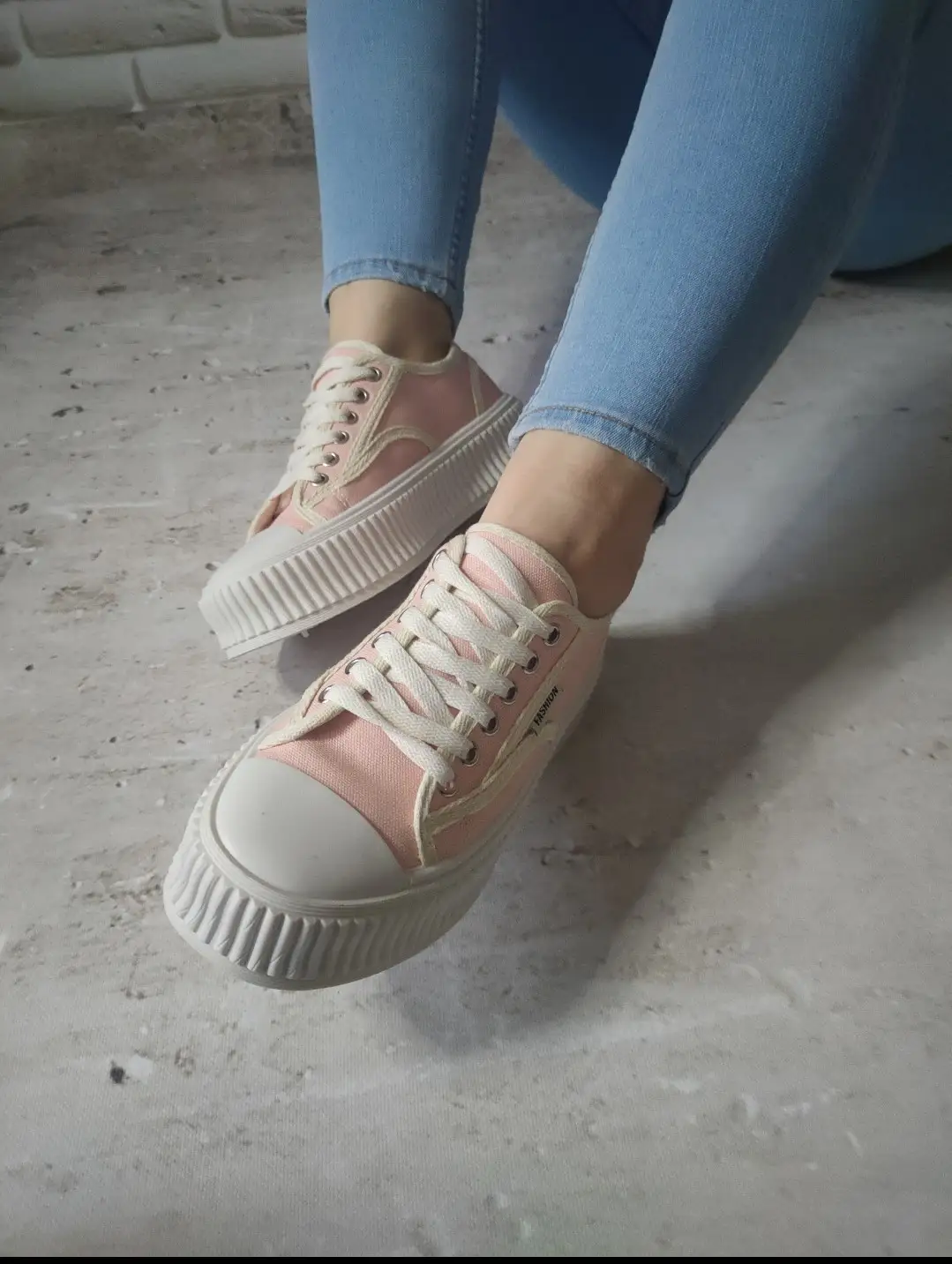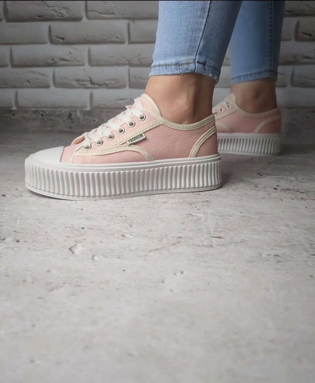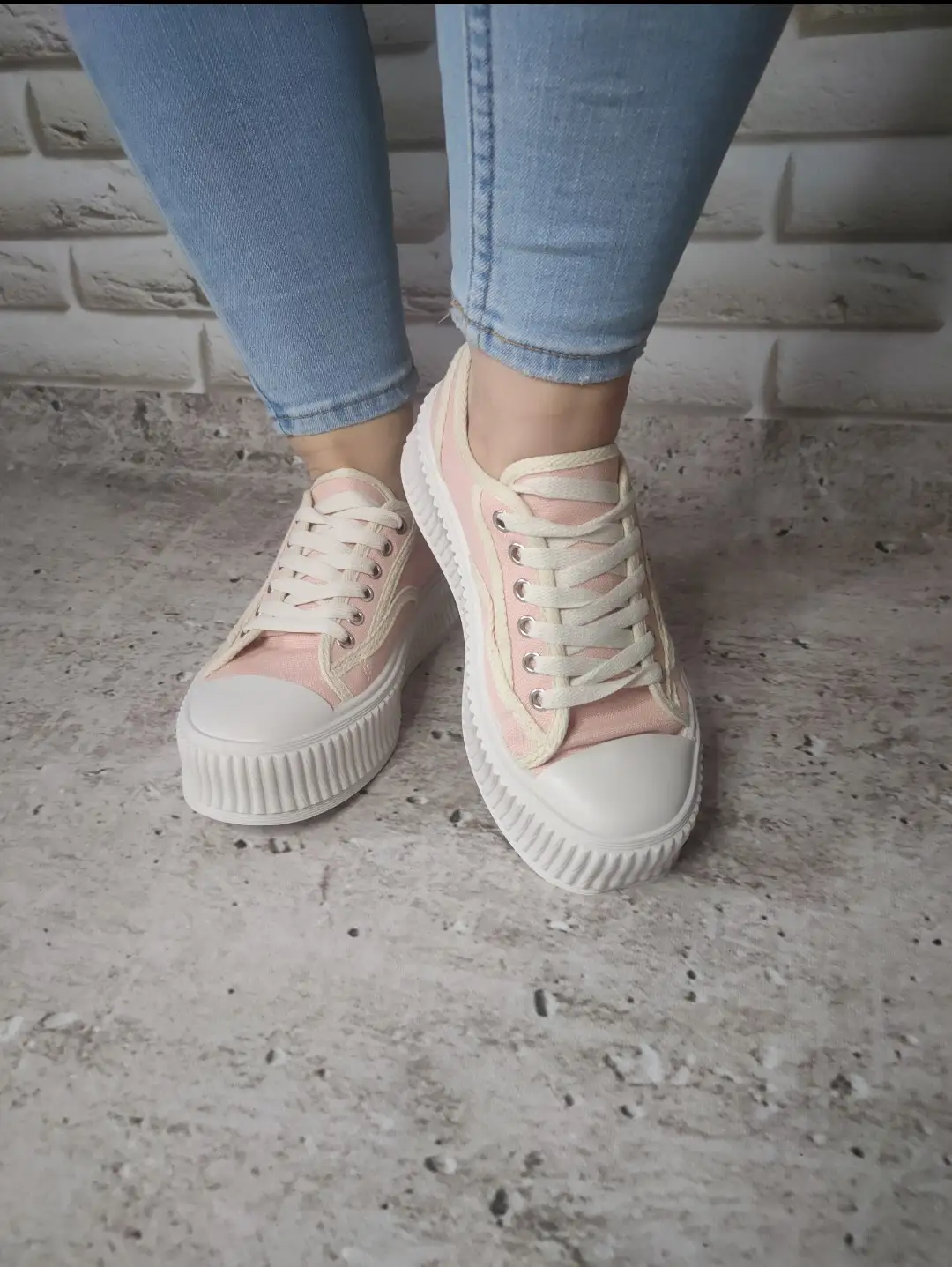 Stylowe sportowe trampki damskie wykonane z materiału tkaninowego. Model na wygodnej platformie. Cholewka jest sznurowana. Świetne do tworzenia casualowych outfitów!