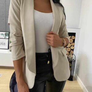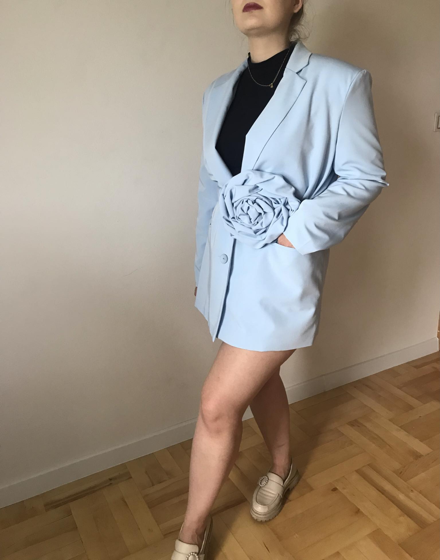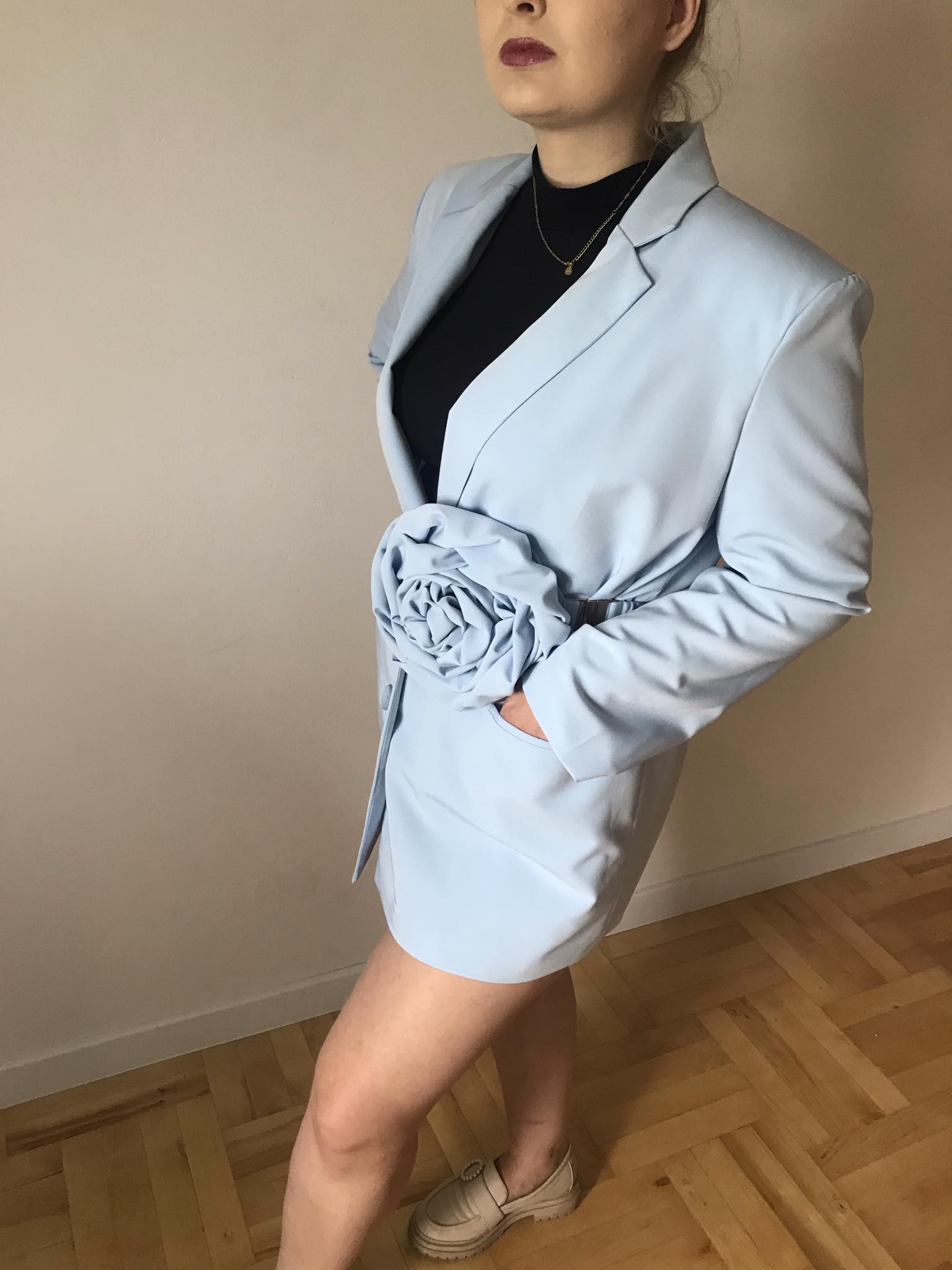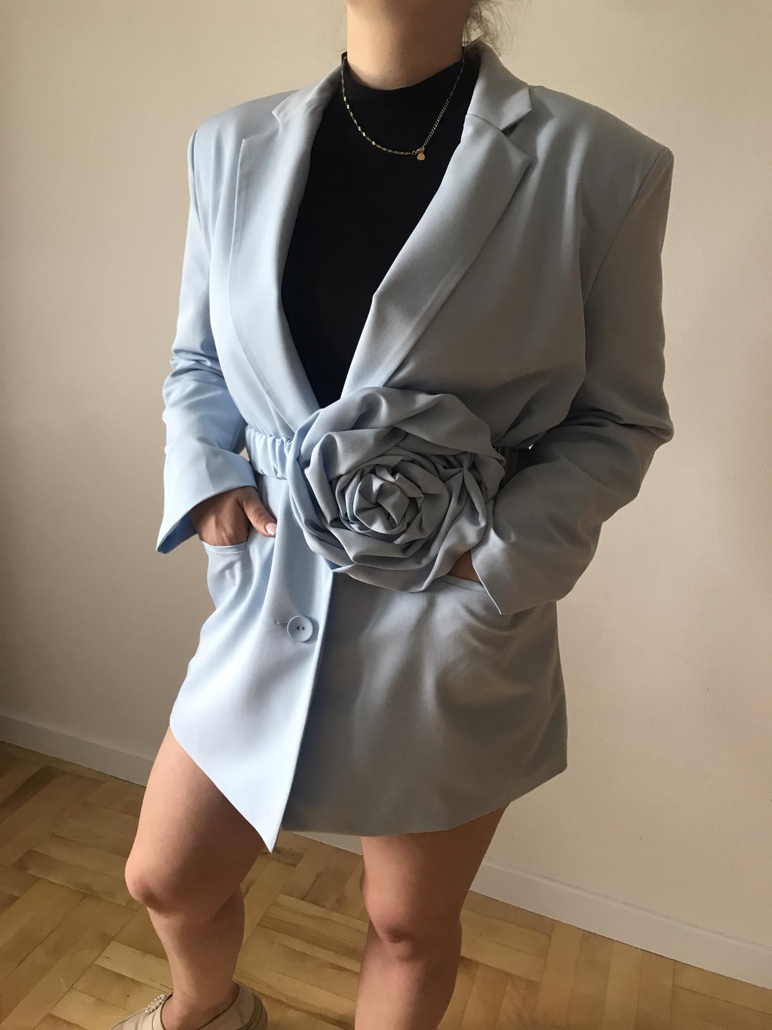 Przepiękny żakiet w kolorze błękitnym z paskiem, do którego przyszyta jest duża róża. Obszerna marynarka daje duże możliwości stylizacji. Pasek z różą jest bardzo funkcjonalny
